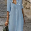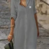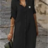 Crafted from lightweight, breathable fabric, this shirt dress ensures ease of movement without compromising on style. The soft texture feels gentle on the skin, making it ideal for long days on the go. Roll up the sleeves for a laid-back vibe or keep them down for a more polished appearance—the choice is yours.