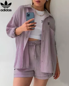 The Adidas – New Trendy Set doesn’t just shine on its own—it plays well with your entire wardrobe. Pair the button-up top with high-waisted jeans or flowy skirts for a breezy daytime look, or mix the shorts with a cropped tee or bikini top for beach-ready vibes. Its neutral tone and modern texture make styling a breeze, giving you endless outfit combos with minimal effort.