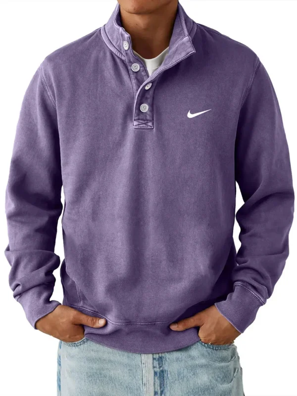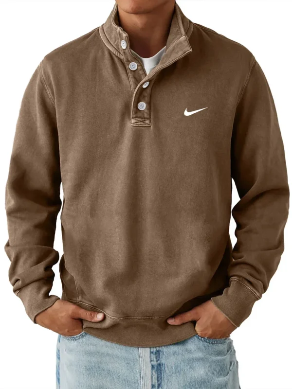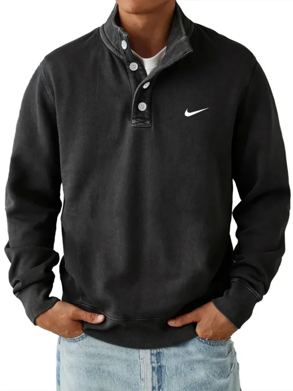 The Nike – New Trendy Sweater exudes casual sophistication, featuring a clean, modern silhouette and a refined button-up collar. Its sleek design and minimalist embroidered logo create a versatile, stylish look, perfect for layering over casual tees or pairing with tailored trousers for a smart-casual ensemble.